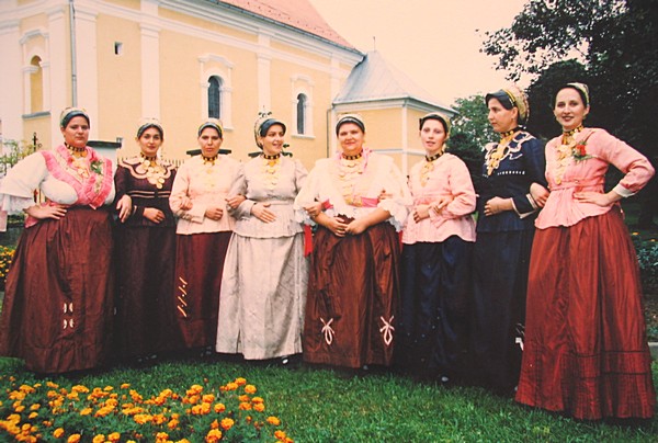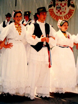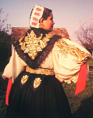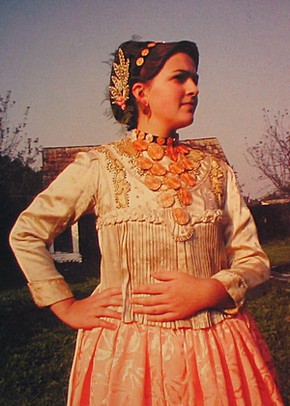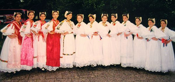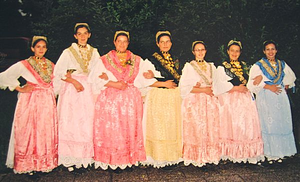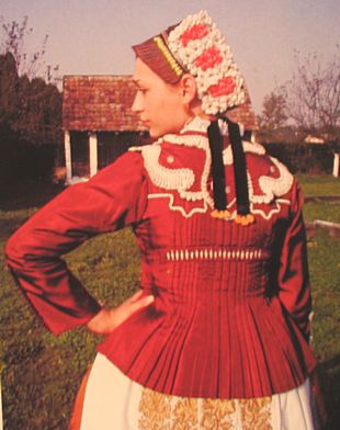 Bijela nošnja (Svečana) - Ženska - Nošnja se sastoji od šlinganog šotesa, pregače i ćoška, i svilene tkanice crven-bijeli-plavi. Oko vrata dukati povezani u grozd, a na glavi pletenica, kuštra i ružica. Na nogama lakovane sandale. - Muška - Nošnja se sastoji od šlinganih gaća i rubine, kamizola i svilene tkanice crven-bijeli-plavi. Na glavi kapa. Na nogama opanci. |