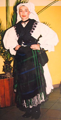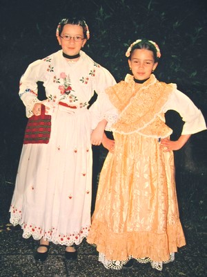 Bijela nošnja (Svečana) - Ženska - Nošnja se sastoji od šlinganog šotesa, pregače i ćoška, i svilene tkanice crven-bijeli-plavi. Oko vrata dukati povezani u grozd, a na glavi pletenica, kuštra i ružica. Na nogama lakovane sandale. - Muška - Nošnja se sastoji od šlinganih gaća i rubine, kamizola i svilene tkanice crven-bijeli-plavi. Na glavi kapa. Na nogama opanci. |