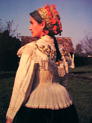 Svatovska nošnja - Ženska - Nošnja se sastoji od vunene suknje, ćoška i pregače krpanih s jagodama ili šlinganih i kratkog kožuha (kožuška). Oko vrata dukati povezani u grozd, a na glavi šlingana marama. Na nogama čičkave (guličave) čarape i opanci. - Muška - Nošnja se sastoji od rajtoznih hlača, rubine i puličavog kožuha. Na glavi kapa. Na nogama čičkave (guličave) čarape i opanci. |